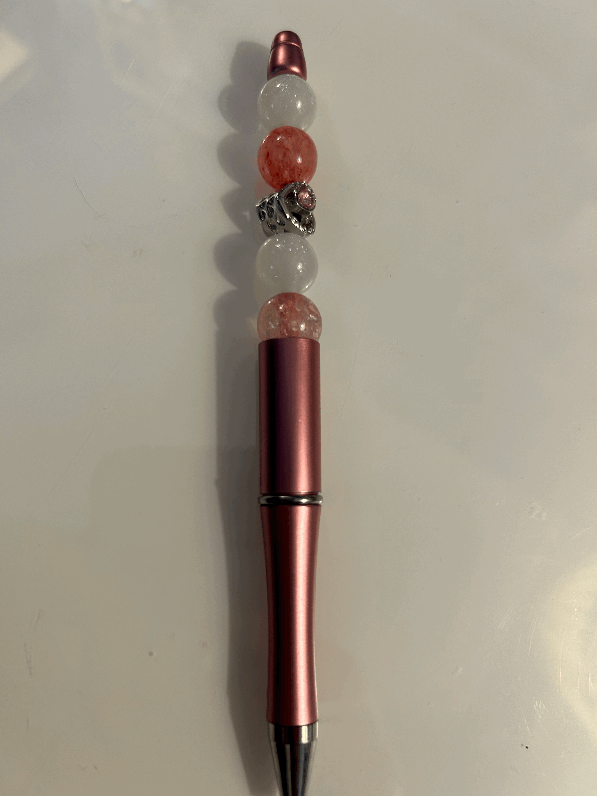 Discover our heart charm ballpoint pen with pink and white glitter beads for a touch of sparkle in your daily writing. Add whimsy to your notes and make every word special.
